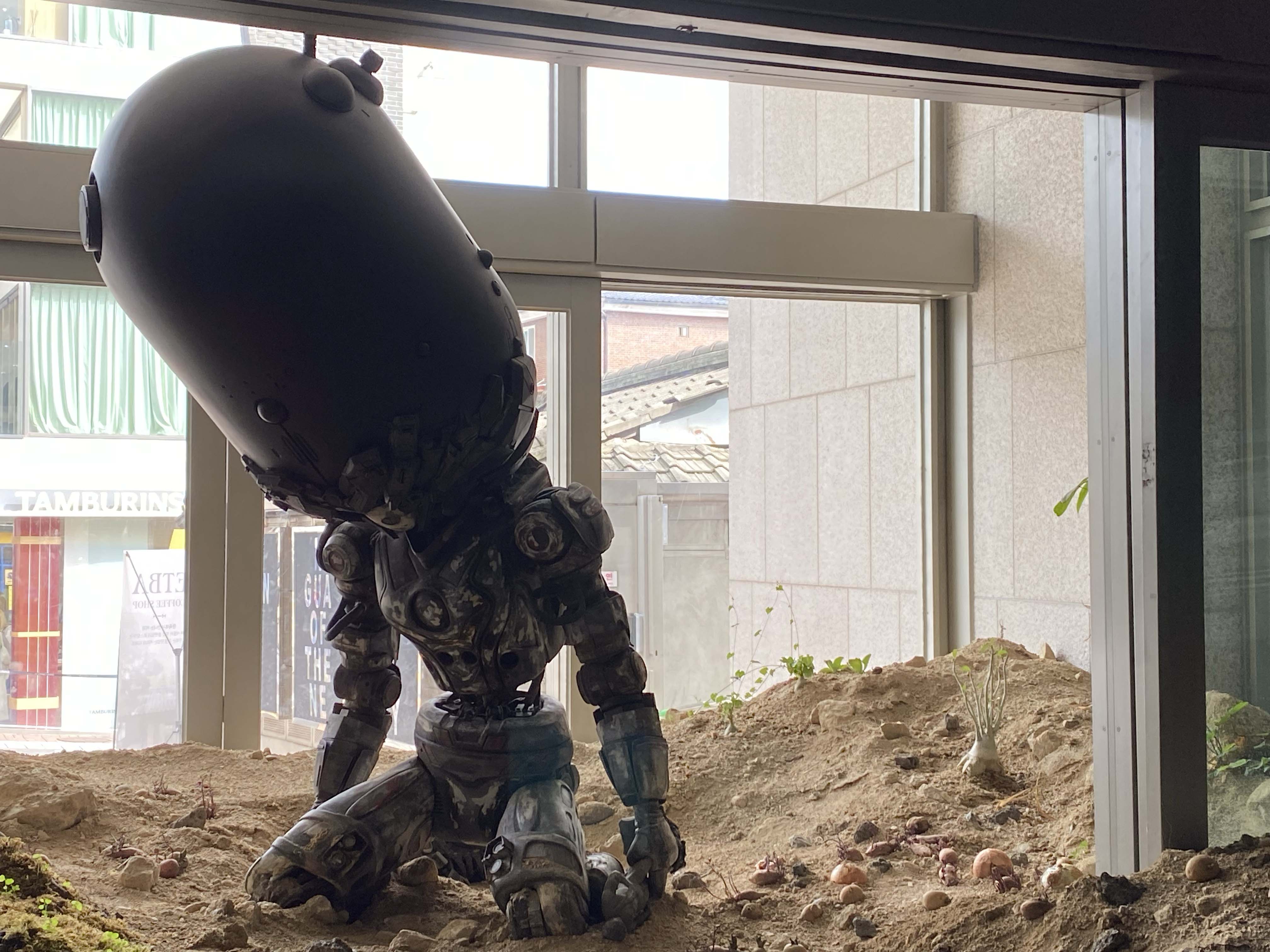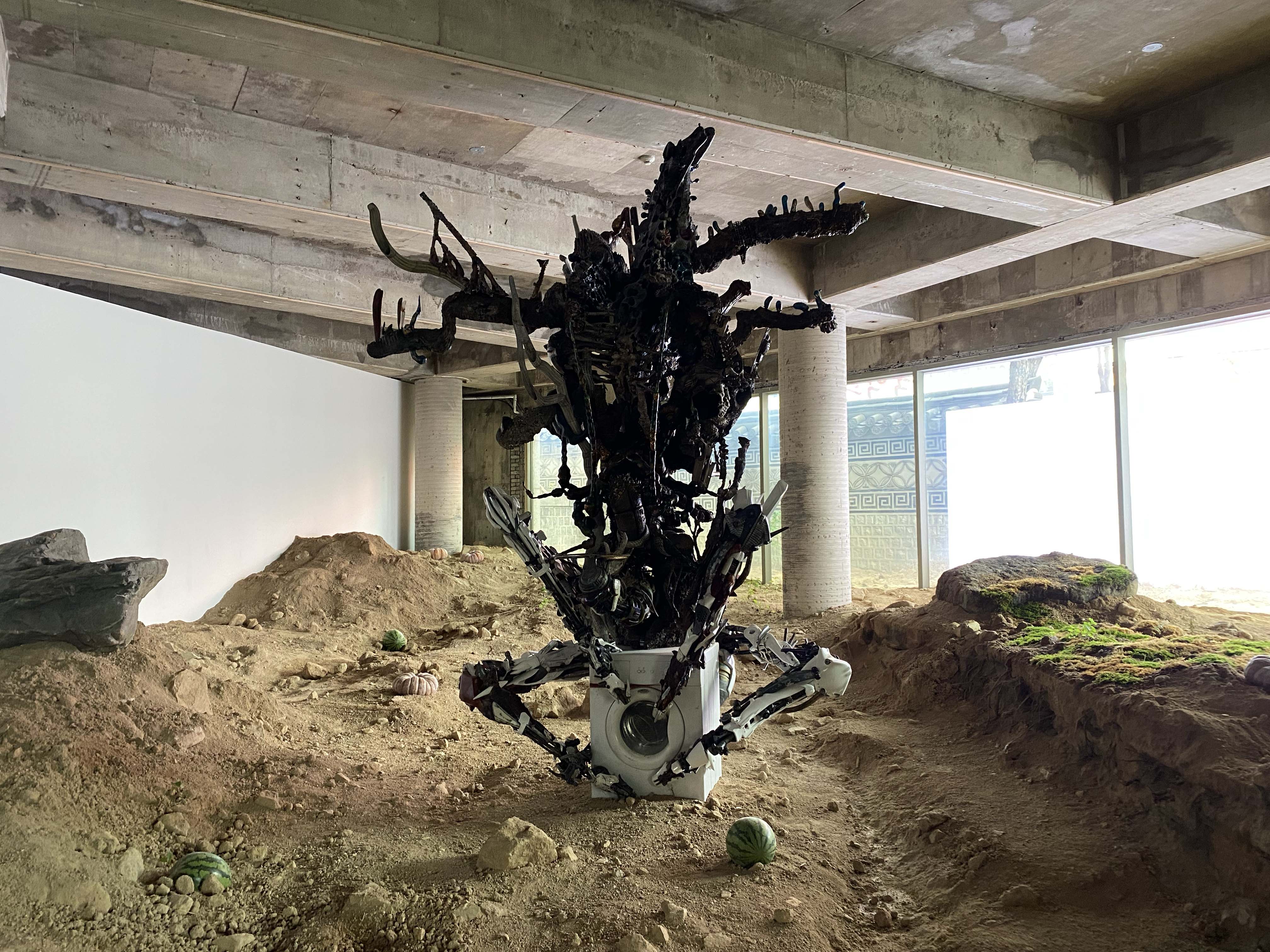 계단을 통해 1층으로 올라가면 미술관 바깥에서 보았던 것을 마주한다. 방대하게 쌓인 흙, 세탁기를 붙잡고 있는 기계체, 무릎을 꿇고 죽은(?) 듯한 기계체, 비워진 데스크, 마찬가지로 훼손된 전시 서문, 갑자기 놓여 있는 수박 등. 미술관의 익숙한 틀과 미술관에 익숙하지 않은 사물 및 형상이 혼재되어 있다. 공간은 어느 한쪽으로 규정되지 않는다. 완전히 새로운 곳도 아니고 완전히 익숙한 곳도 아니다. 작품은 침묵하여 설명하지 않는다. 관람객은 미술관의 이러한 변이를, 완전한 외계 적의 침략으로 인해 일어난 일로 간주할지 모른다. 하지만 이 형체, 그러니까 작가의 연작 중 하나인 〈상상의 종말Ⅳ〉(2024)은 이곳의 환경에 의해 탄생한 기계체다. 해당 작품에 쓰인 작가의 ‘타임 엔진’은 “비디오 게임 엔진과 인공지능, 그리고 가상 세계를 결합한 일종의 디지털 시뮬레이션 도구”2)다. 가상이라는 점에서 현실과 거리가 떨어져 있는 듯하지만, 이 가상 세계는 생물, 생태계, 사회, 정치 등 현실 세계에 있는 다양한 요소들이 포함된 곳이다. 해당 요소들은 가상 세계 속에서 뒤섞이며 물질을 만들어 내고, 작가는 현실 세계에 있는 물질을 통해 그것을 구현한다. 즉, ‘현실 세계↔가상 세계’의 경로를 통해 현실과 가상의 경계를 흩뜨리는 것이다. 게임 캐릭터를 눈앞에 마주했을 때 이 상황을 현실이라고 불러야 할지 가상이라고 불러야 할지 알 수 없어지는 것처럼 말이다. 작가는 이에 관해 “인간이 세계에 형식을 부여하는 것이 아니라, 세계가 스스로 작용해 현실을 만들고, 그 현실이 다시 물질을 창조”하는 것이며, 이는 “창작 행위에 대한 근본적인 존재론을 전복하는 방식” 3)이라고 말한다.