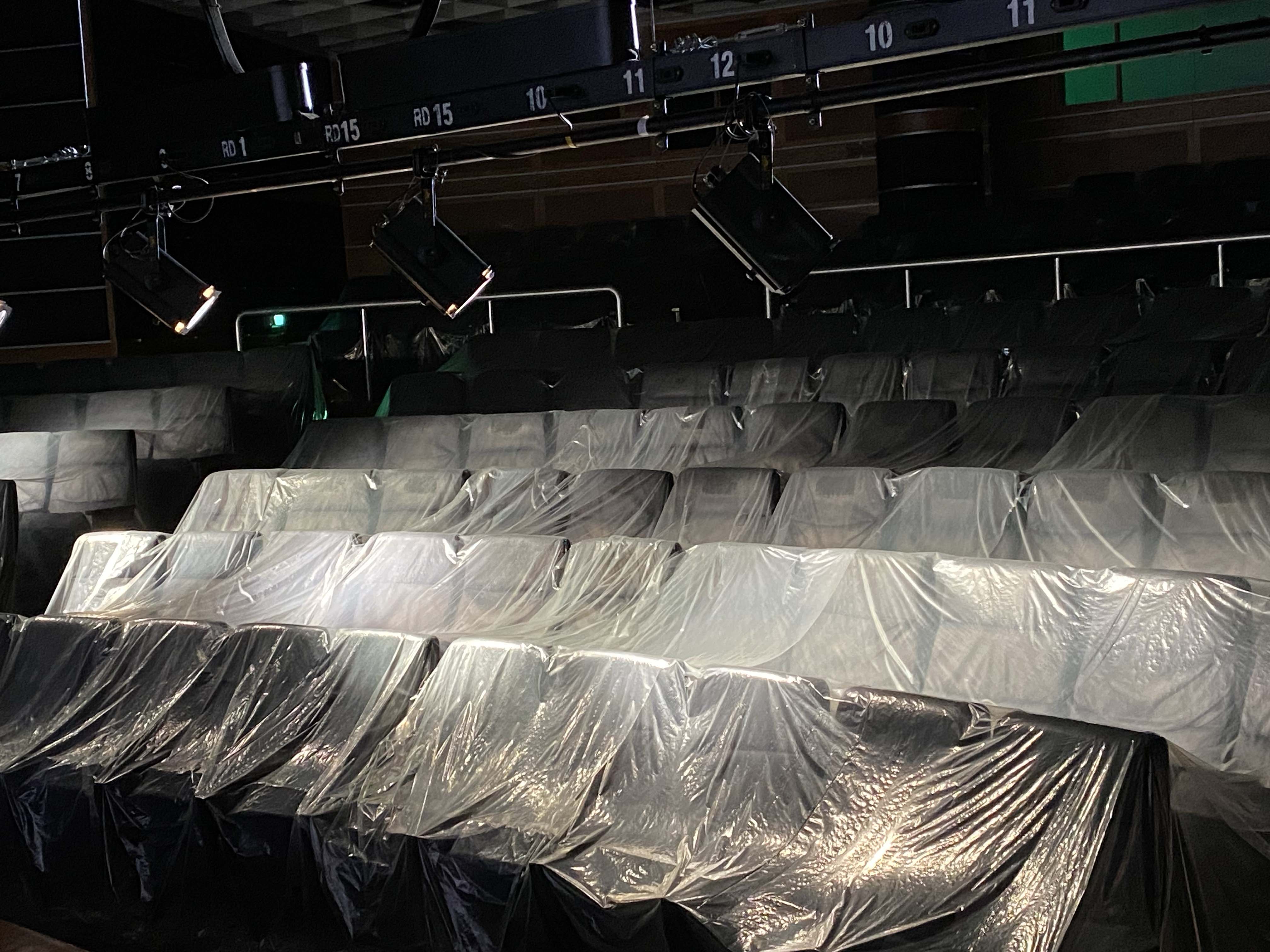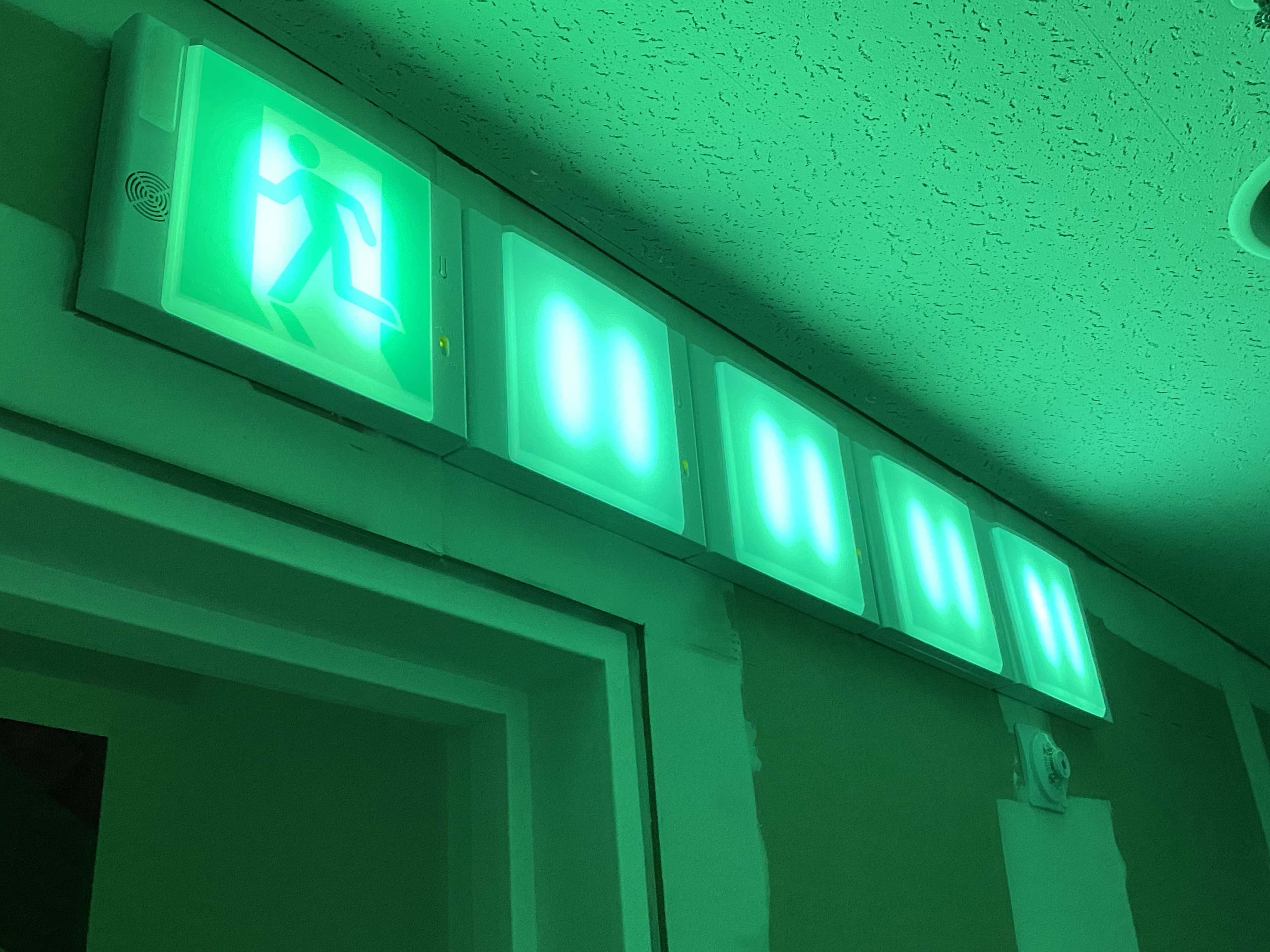 계단을 통해 지하로 내려가며 작가의 사인인 오르네르 둥지를 지나고, 본래 상영관으로 연결되던 입구가 본격적인 시작이다. 그 시작점에 있어야 할 월 텍스트 전시 서문은 뭔가에 긁힌 채 대부분 훼손되어 있다. 안쪽으로 들어가면 아트선재센터의 상영관이 나오는데, 그곳 역시 아주 오랜 시간 전에 폐쇄된 듯, 객석은 넓은 반투명 비닐로 덮여 있다. 상영관 천장의 조명은 바로 아래 객석을 비추고 있고, 영사기는 영사실 창문에 붙은 작은 판에 빛을 쏘고 있다. 그 판에는 밤처럼 푸른빛이 도는 색 위로 인간의 손바닥이 하얗게 찍혀 있다. 본래 강연이나 영화를 상영했을 이 공간은 그 기능을 완전히 상실해 버린 어느 시간대의 모습을 보여준다. 그러나 작가는 관람객을 단지 미래의 시공간으로 옮기는 것에 목적을 두지 않는다. “더 이상 ‘가까운 미래’라는 개념을 믿지 않게 된 것 같”다는 작가에게 이곳은 미래의 시공간이라기보다, “제대로 준비되지도 않은 채 당도한 수많은 미래들” 중 하나가 있는 “현재”1)다. 우리는 이미 어느 인간의 미래에 있다. 운전자가 손을 놓고도 스스로 가는 차량을 상상하던 이들의 미래에 있으며, 인간과 감정적으로 교류하는 인공지능을 상상하던 이들의 미래에 있다. 그런 이들에게 이것들이 익숙한 이들은 미래의 인간과 다름없다. 단지 ‘세대 차이’로 규정되어 익숙해져 있을 뿐이다. 그러니까 낡고 큰 등산 가방을 메고 폐허가 되어버린 미술관으로 들어와 물건을 줍는 듯한 ‘인물’은 어느 허구적 사건이 아니라 ‘지금’의 일이라는 것이다. 상영관을 나오면 마주하는, 불필요하게 반복되거나 픽토그램이 지워진 비상구 유도등처럼, 어떤 일에 의한 익숙한 것들의 변이 역시도.