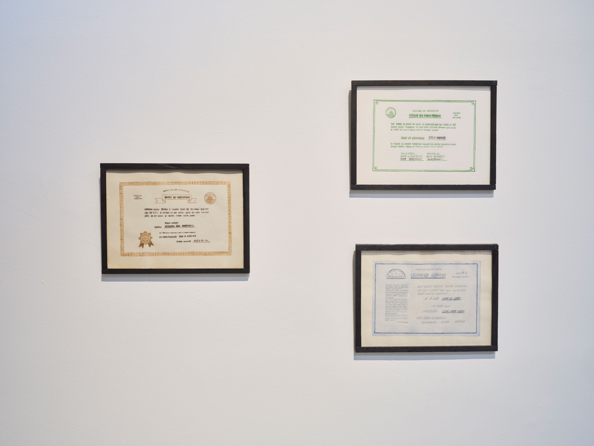 김범은 우리의 이 관습적 인지 태도를 지연시키거나 이를 하고 있다는 것을 인지시킨다. 〈백자청화스피노사우르스문호〉(2004)는 얼핏 보면 고급스러운 백자로 인지된다. 하지만 작품에 가까이 다가가면, 그것은 고급스러운 백자가 아니라 지점토로 투박하게 만들어졌으며 문양 역시 투명 락카로 그려진 우스운 용이라는 사실을 알게 된다. 관객으로서 우리는 백자로서 성급하게 판단했다는 것을 스스로 인식할 수 있다. 〈소품〉(2001) 연작은 얼핏 보면 자격증으로 인지된다. 하지만 작품에 가까이 다가가면, 그것은 영향력 있는 자격증이 아니라 그저 흐릿한 선으로 이루어진 드로잉일 뿐이라는 사실을 알게 된다. 이 역시 관객으로서 우리는 자격증이라고 성급하게 판단했다는 것을 스스로 인식할 수 있다. 작가의 작업에 의해 대상은 “이미 사회에서 획일적으로 고착된 실재성이, 작가가 열어둔 틈새 공간에서 인식이 유보되는 현상으로”6) 나타난다. 그것이 당연히 그것일 거라는 관습적 인지 태도를 지연 및 배반시키면서, 우리가 당연히 그것을 그것이라고 받아들이는 태도를 인식하게끔 한다. 대상에 관한 판단이 그에 관한 기존의 이야기로 늘 이루어지고 있다는 것 역시.