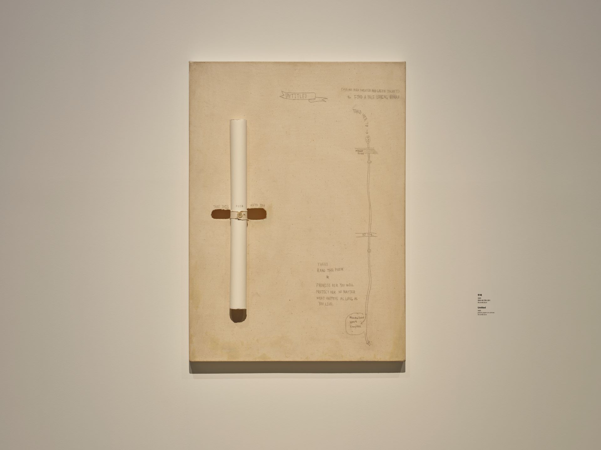 이런 풍경 속에서 우리는 일상에서 쉽게 맞이할 수 없는 사건 속 가상의 ‘나’를 마주한다. 경험할 수 없던 이야기를 체험해 보는 것이다. 〈잃어버린 양〉(1997)을 살펴보자. 작품은 왼쪽 모서리에 턱수염과 콧수염을 걸어 두고, 텍스트로 일련의 지시문을 캔버스 위에 형성하고 있다.